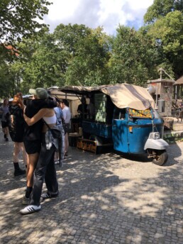 unserem Café in Kreuzberg und unterwegs mit unserer Piaggio Ape.